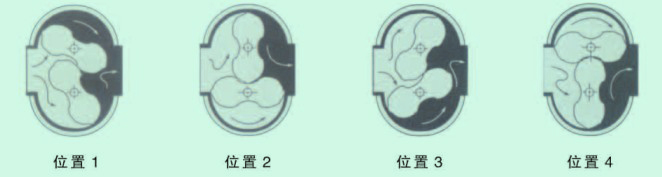 工作原理:TLGQ系列氣體腰輪流量計,主要由殼體、共軛轉(zhuǎn)子和計數(shù)裝置等部件構(gòu)成。裝于計量室內(nèi)的一對共軛轉(zhuǎn)子在流通氣體的出入口壓差(P入>P出)作用下,通過精密加工的調(diào)校齒輪使轉(zhuǎn)子保持正確的相對位置。轉(zhuǎn)子間、轉(zhuǎn)子與殼體、轉(zhuǎn)子與墻板間保持最佳工作間隙,實現(xiàn)了連續(xù)的無接觸密封。轉(zhuǎn)子每轉(zhuǎn)動一周,則輸出四倍計量室有效容積的氣體,轉(zhuǎn)子的轉(zhuǎn)數(shù)通過磁性密封聯(lián)軸裝置及減速機構(gòu),傳遞到積算指示計數(shù)器,從而顯示輸出氣體的累積體積量,其計量過程和工作原理如下圖所示:(圖中僅表示了四分之一周期)。